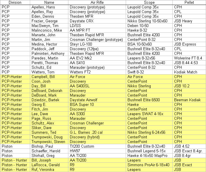 At the conclusion of round 2 the scores were tallied and we had a tie for 1st place in Piston Division between Paul Bishop and Harold Schaeffer who each had total scores of 57, and a tie for 2nd place in PCP Division between Hans Apelles and Jeff Paddock who each had scores of 66. A shoot-off was used to break the tied scores by having each competitor take one shot on targets with a 1/2" kill zone set the same random distance down range. The targets would be moved further down range as necessary until the matter was settled. The PCP Division went first and the matter was settled quickly as Hans missed on his attempt but Jeff was was successful in downing his target to claim 2nd place. Next the Piston Division was called to the line so Paul and Harold could break their tie. Both shooters were unsuccessful on their first attempts but both were able to make their shots on attempt number two so the targets were moved back for the next shot. Paul took his shot first but was not able to down his target. Harold then launched his pellet toward the target and it was a perfect strike, giving him the victory. With the tied scores now broken the score board was finalized. The first place finishers were Tim MacSweys in PCP Division with a score of 67, Bill Day in PCP-Hunter Division with a score of 64, Harold Schaeffer in Piston Division with a score of 57, and Gerald LaRocca in Piston-Hunter Division with a score of 39. The second place finishers were Jeff Paddock in PCP Division with a score of 66, Bartek Dziedzic in PCP-Hunter Division with a score of 57, Paul Bishop in Piston Division with a score of 57, and Joseph Bill in Piston-Hunter Division with a score of 30. The third place finishers were Hans Apelles in PCP Division with a score of 66, Georg E. in PCP-Hunter Division with a score of 56, Greg Shirhall in Piston Division with a score of 34, and Veronika Ruf in Piston-Hunter Division with a score of 29. Scores for the entire field of shooters were as follows: