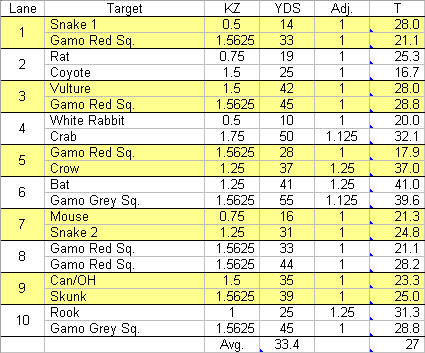 We set up 9 lanes with 2 targets per lane. There was an abundance of Gamo critters roaming around and no reducers were used. Due to the conditions we didn't determine T values but our course usually comes in around T=20 when no reducers are used.