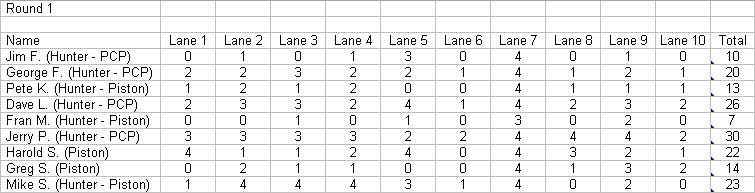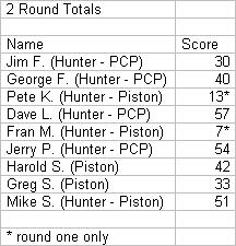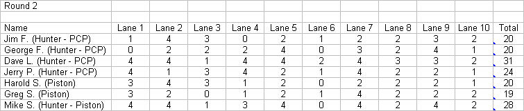 | Mike S. (Hunter - Piston) | 4 | 3 | 0 | 2 | 4 | 0 | 2 | 3 | 3 | 21 |